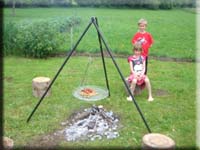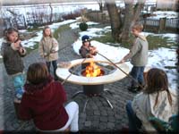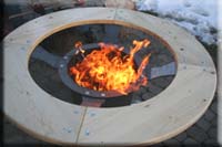 Durch niedrige Bauhöhe Flammen gut einsehbar, Tischplatte aus Fichte, sicherer Stand durch fünf Standbeine, Befeuerung mit trockenem Scheitholz, gut geeignet für Kinderfeste zum Würstchengrillen. |